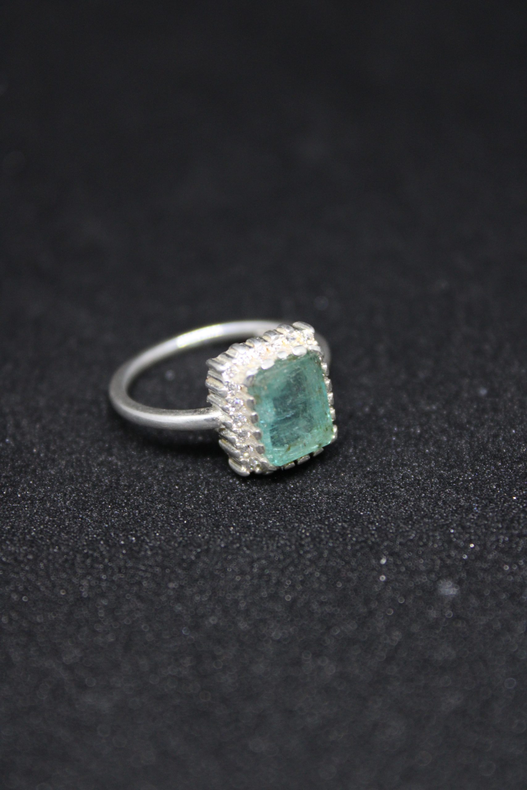 This exquisite sterling silver ring showcases a natural emerald in a classic halo setting, surrounded by sparkling zircon stones. The vibrant green hue of the emerald adds a touch of luxury and sophistication, making it a perfect statement piece for any jewelry collection.