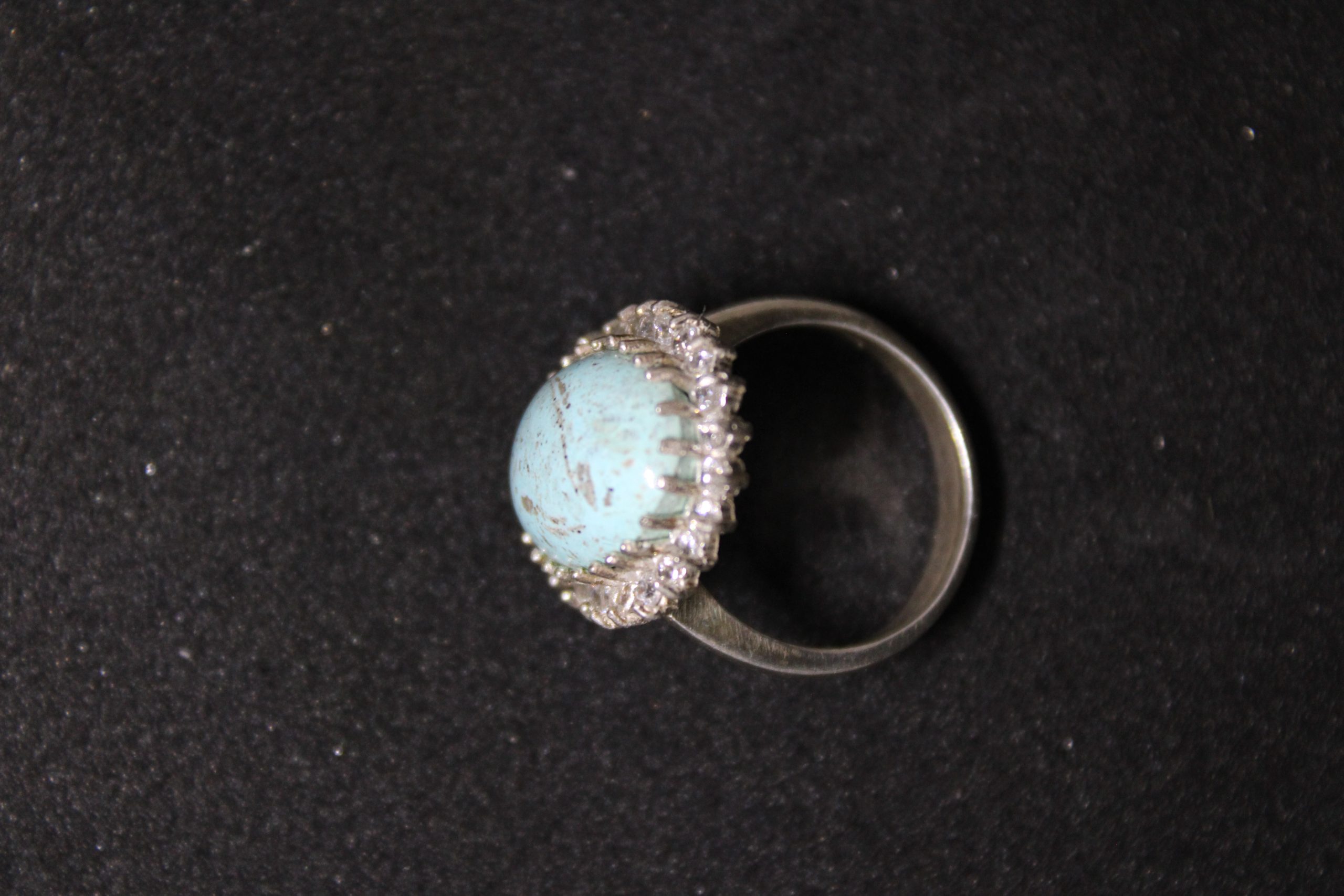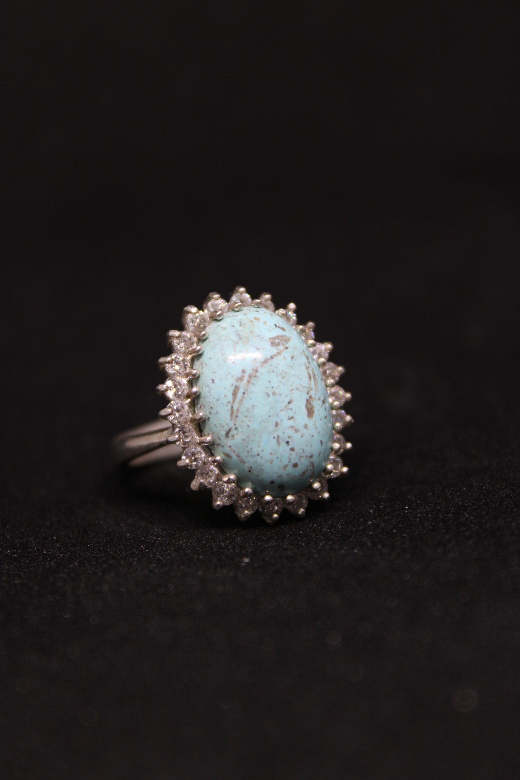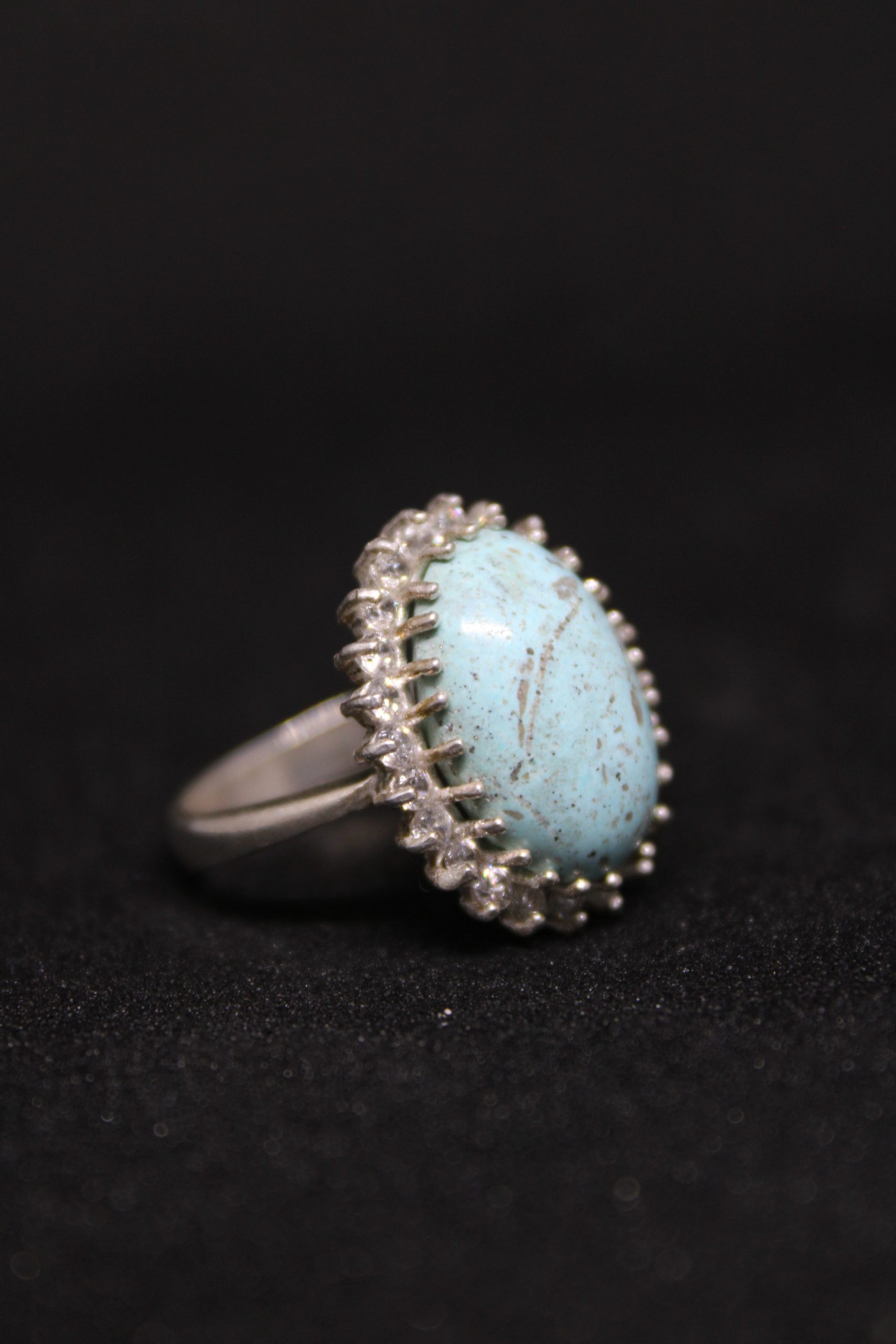 This beautiful ring showcases a vibrant oval-shaped turquoise gemstone, surrounded by shimmering zircon accents set in a high-quality sterling silver band. The natural patterns of the turquoise add a unique touch, making this piece perfect for everyday wear or as a standout accessory for special occasions. A timeless design for lovers of natural stones and elegant jewelry.